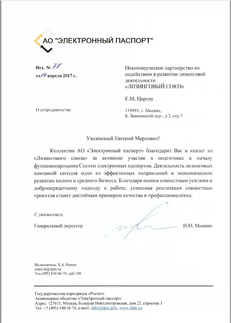 В адрес Подкомитета ТПП РФ по лизингу поступило письмо от коллектива АО «Электронный паспорт» с благодарностью за активное участие в подготовке к началу функционирования Систем электронных паспортов.
